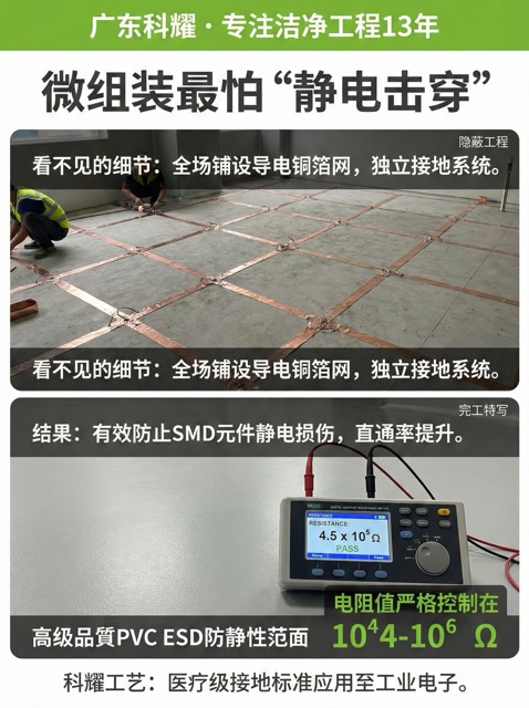 这些看不见的细节工程,正是区分专业洁净工程公司与普通装修公司的关键所在。广东科耀采用医疗级接地标准应用于工业电子车间,确保每一个细节都经得起检验。